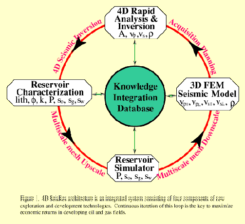 We are developing a 4D seismic reservoir simulation that couples a) the analysis of repeated 3D seismic surveys, b) seismic inversions of each, c) geostatistical reservoir characterizations of each, d) massively parallel reservoir fluid flow simulations, and e) 3D seismic modeling of wave propagation at different time-lapse intervals in an anisotropic, elastic media. This computational environment will connect existing codes that plug-and-play in each of these slots, but deliver an internally consistent answer. Drainage predictions are converted in the seismic simulator into expected acoustic responses, which are then tested against the real-world observations. The loop is constantly iterated so that the system learns the correct fluid flow behavior over time (Figure 1). Better, more efficient drainage performance is the hoped-for result.