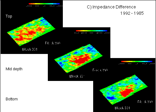 Figure 7. Difference between 3-D seismic model predictions of impedance in 1985 versus 1992 based upon the drainage effects determined from the impedance inversions of the two seismic datasets.