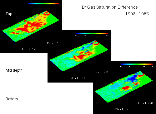 This difference between 1985 and 1992 seismic models (Figure 7) should then be compared with the gas saturtation difference over the same time interval from the reservoir simulator (Figure 5) and the seismic inversion differences (Figure 4). Only when these three representations of drainage in the LF reservoir from 1985 to 1992 have been reconciled can we begin to believe in the accuracy of our 4D predicitons.