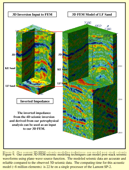 3. The results from the reservoir simulator are then fed into the several million element mesh of a seismic model that predicts the seismic response over time. In order to deal with dispersion and attenuation in stacked pay and acoustically complex reservoirs (most oil fields), the 3D model must be elastic. Probably, five independent elastic constants are required to vary among each volume element over time in order to compute realistic synthetic waveforms.