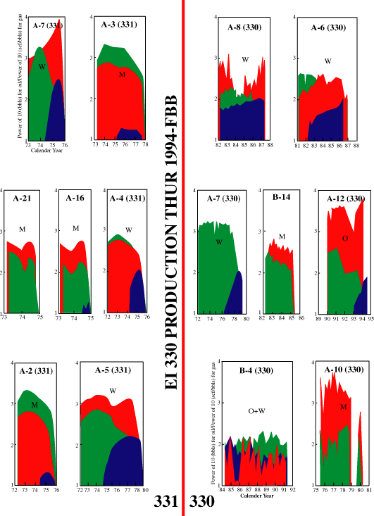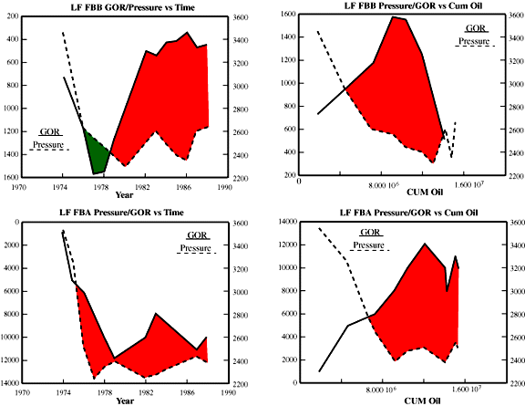 Pressures in FBB are similar to those in FBA, but GORs are more than an order-of-magnitude less. Whereas downdip gas halps were seen to grow around the A-11 and A-6 wells by 1992 time, but were gone by 1994 time in FBA, there was no production at all from downdip in FBB over then entire time-lapse of our 4 3D seismic surveys, and updip wells were producing a very low GOR's the whole time. Yet, the brightness downdip continued to increase with each new survey. Only with reservoir simulation will we be able to estimate the gas content in the formation downdip. Poor connectivity with the updip reservoir is obvious, though. The difference between 1985 and 1994 surveys shows that the major increases in amplitude occurred along two bands that, interestingly, are perpendicular to the major depositional fairway in the EI 330 field.