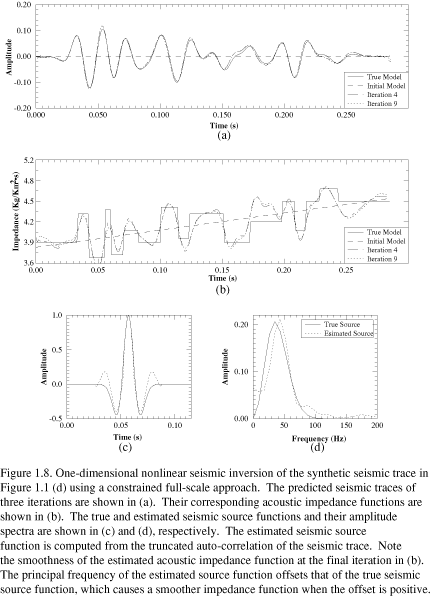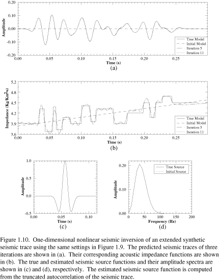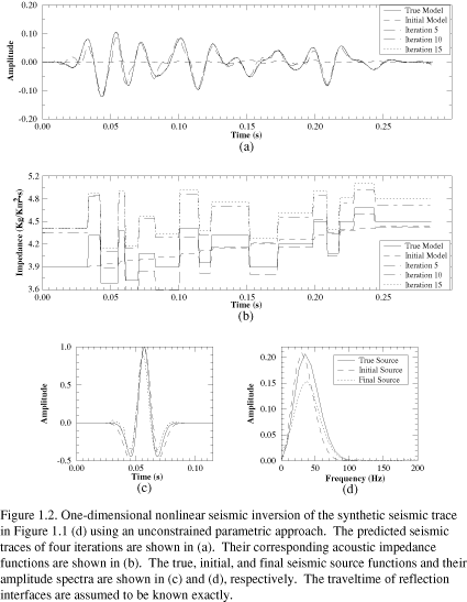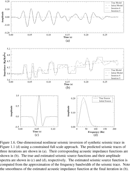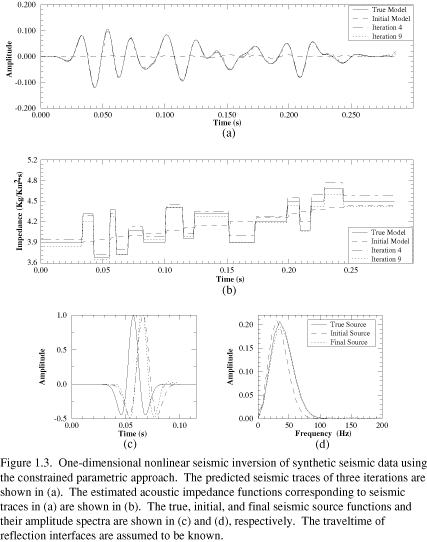 Because the objective function (Eq. 1.3) is the sum of two terms having different sizes, we scale one relative to the other so that the inversion is not dominated by either of them. The estimated acoustic impedance functions, predicted seismic traces, and seismic source functions are shown in (Figure 1.3). Both estimated impedance and seismic source functions are better resolved than in the unconstrained inversion. The average relative error between the estimated acoustic impedance function and the true impedance function is 1.5%. The imperfect match between the estimated and true impedance may be caused by improper choice of the covariance functions, the large departure of the reference model from the true model, or the improper scaling factors applied to different data types. Repeated experiments with minor modification on the a priori model (including both seismic source function and impedance model) give similar results, suggesting that this is the limit of precision of this inversion method. The optimized seismic source function is well-resolved regardless of the differences in the starting source function.