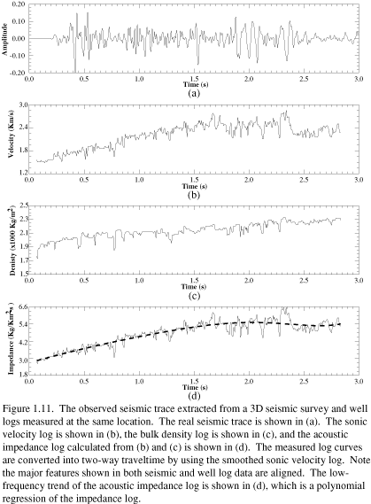 A seismic trace extracted from a 3-D stacked and migrated seismic survey in the EI-330 Field of offshore Louisiana is shown in (Figure 1.11) (a). Sonic and density logs from a well at the same location are shown in (Figure 1.11) (b) and (c). The impedance log derived from the sonic and density logs is shown in (Figure 1.11) (d).