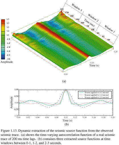Extraction of the seismic source function from real seismic data requires special attention. Geological formations are low-pass filters to seismic waves. High frequencies are lost as waves propagate deep into the earth's crust. Normally, the stacked and migrated seismic traces are filtered differently along their length to account for the lower and lower frequency content. Bandpass filters with different frequency bandwidths are used in different time windows. (Figure 1.13) (a) illustrates the different frequency bandwidths that were applied to the seismic trace shown in (Figure 1.11) (a). The autocorrelation function at each time step is computed from a truncated seismic trace segment that starts from the current time and contains 251 subsequent sample points of the seismic trace. Three different seismic filters apparently have been applied to filter the seismic trace within windows 0-1, 1-2, and 2-3 seconds, respectively. Three extracted zero-phase seismic source functions for these three windows are shown in (Figure 1.13) (b). The frequency bandwidth of these extracted source function decreases from shallow to deep. These three different seismic source functions are used in the convolution model, constraining, the predicted seismic trace to have the same frequency content as the observed seismic trace.