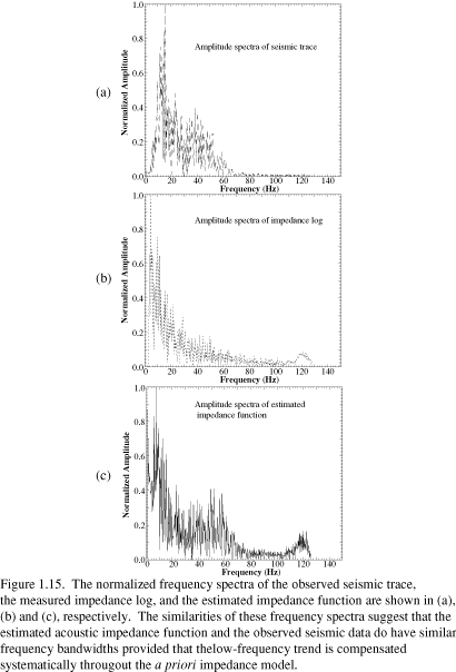 The estimated impedance function and predicted seismic trace are shown in (Figure 1.14). The predicted seismic trace matches the observed seismic trace well even though the estimated seismic source functions are not necessarily the true seismic source functions. The relative error of the estimated impedance function is 22.5%. However, the match is particularly good at times where significant seismic amplitude contrasts exist. For example, the average relative error between 1.7 and 2.5 seconds is only about 5.7%, within which more than five major hydrocarbon reservoirs are present. The large differences between the observed and estimated impedance functions may be attributed to differences in measuring techniques and frequency range (10 KHz for sonic logging, 30 Hz for the seismic profiling), because the acoustic properties measured at sonic logging frequency are strongly affected by intrinsic attenuation, in situ attenuation and frequency-dependent scattering. The use of our nonlinear seismic inversion technique is justified because the major features present in the observed impedance log are recovered in the inversion results (Figure 1.14) (b). The spectra of the log and inversion results are also quite similar (Figure 1.15).