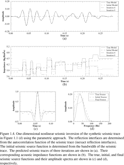 The unconstrained nonlinear inversion is not capable of recovering the true impedance function. It can be used only to derive relative changes in true impedance function. More than one type of model parameters can be simultaneously optimized when properly constrained in the parametric seismic inversion. When exact reflection interfaces are available, the parametric technique is excellent for estimating the seismic source function. However, the estimated impedance functions are generally inaccurate when inexact reflection interfaces are used. The main disadvantage of the parametric technique is its requirement for exact interface information, thus it has limited use in inverting real seismic data. The constrained full-scale nonlinear inversion technique is the most robust method for estimating acoustic impedance from real seismic data.