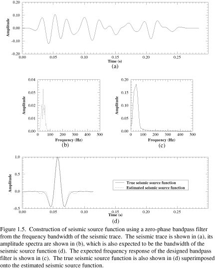Given the synthetic seismogram in (Figure 1.1) (d), its seismic source function is designed to be zero-phase and to have the same frequency bandwidth as the seismic trace (Figure 1.5) (a) and (b). A trapezoidal function is fit to the spectra of the seismic trace, and a zero-phase source function is built from it using an inverse Fourier transform (Figure 1.5) (c). The principal lobes of the two functions are nearly identical, although some differences are observed on the sidelobes (Figure 1.5) (d).